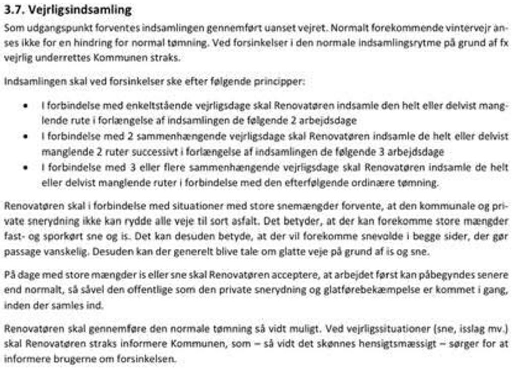 I forhold til vejrligsdage er det beskrevet i punkt 3.7. Her står der klart og tydeligt, at Verdis skal acceptere situationer, hvor den kommunale og private snerydning ikke kan rydde alle veje til sort asfalt. Dertil er det nøje beskrevet, hvor mange vejrligsdage der kan være tale om, og hvornår Verdis skal hente det affald, som man ikke fik med på vejrligsdage. Det har fået flere borgere helt op i det røde felt, at Verdis ikke retter sig efter ordlyden i kontrakten med Furesø Kommune.