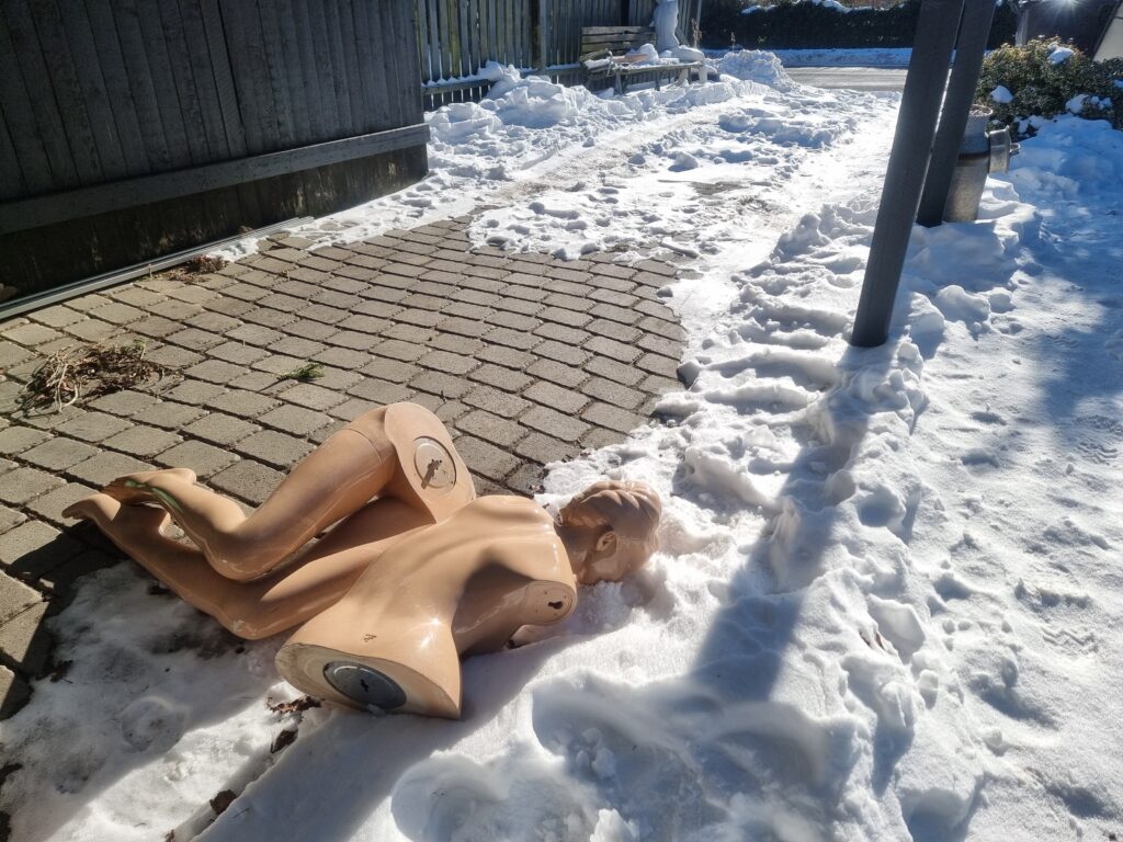 Nu er der godt nyt. Mannequindukken lå i indkørslen hos Bakaos torsdag morgen. Godt nok i to dele, men den kunne samles igen.