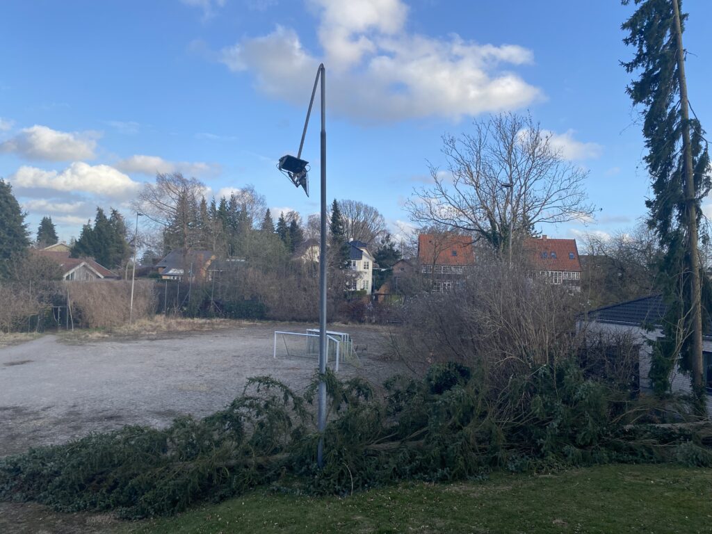 Dog væltede et træ på grusbanen ved Hareskov IF Fodbolds klubhus. Træet ramte en lysmast, som knækkede ved kontakten med træet.