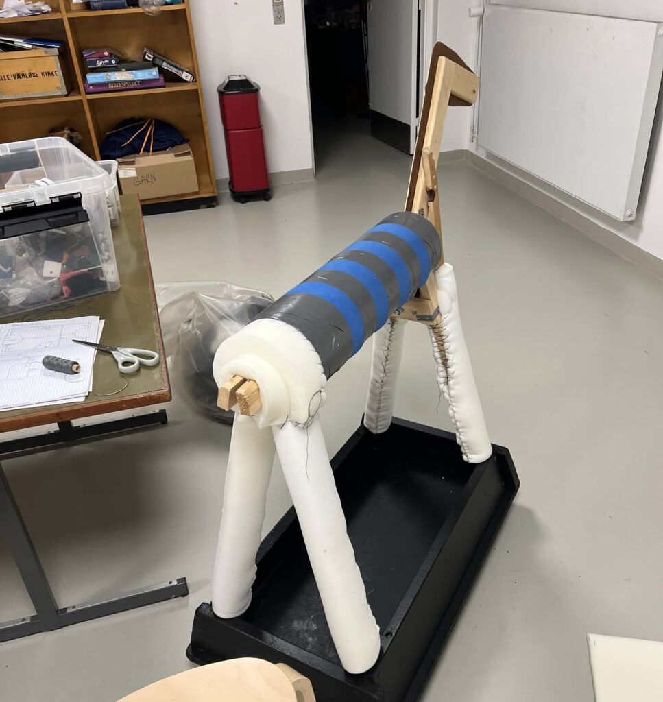 – Vi startede med at finde ud af, hvordan træskelettet skulle se ud. Vi fandt billeder af æsler og kiggede på illustrationer af Jesus på æslet. Kirketjeneren lavede træskelettet, og så tapede jeg et liggeunderlag rundt om og fyldte ud med hobbyskum og pladevat. Vi brugte tre meter gange 80 centimeter rundt om æsler, så det er dejlig blødt for ungerne at sidde på det, fortæller Heidi Falk.