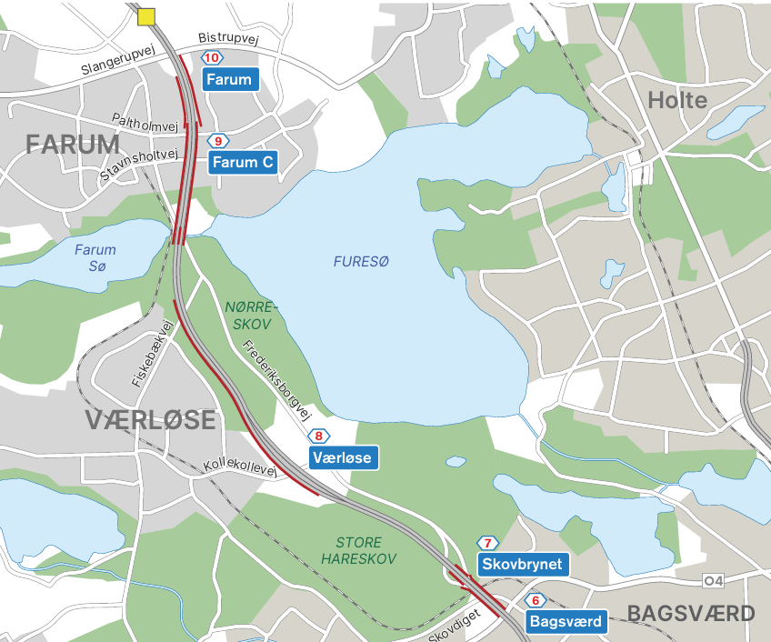 – De største støjreduktioner vil optræde i Værløse og Farum syd, hvor der er beregnet et fald i støjniveauet på 3-9 dB. I Bagsværd og Farum nord vil støjreduktionen være mere moderate, dels fordi der allerede i dag er støjafskærmning langs motorvejen, og dels fordi områderne også er påvirket af støj fra andre større veje end motorvejen, skriver Vejdirektoratet.