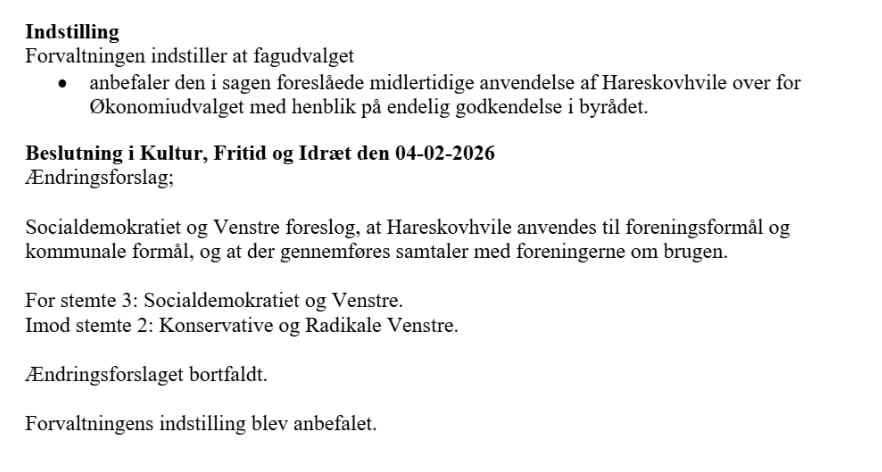 I Kultur, Fritid og Idræt er der desuden forvirring omkring referatet. Her fremgår det, at Socialdemokratiet og Venstre foreslog, at Hareskovhvile anvendes til foreningsformål og kommunale formål, og at der gennemføres samtaler med foreningerne om brugen.