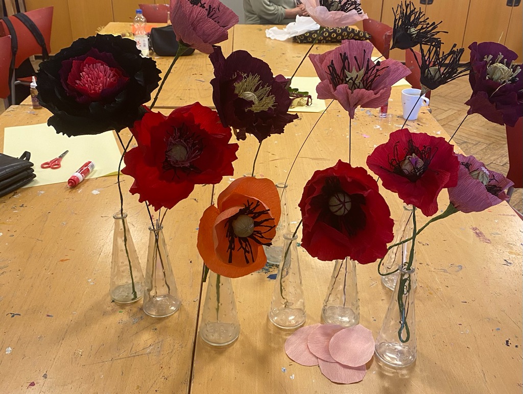 I stuehuset lærer Bente Jensen deltagerne at lave smukke crepepapirsblomster.