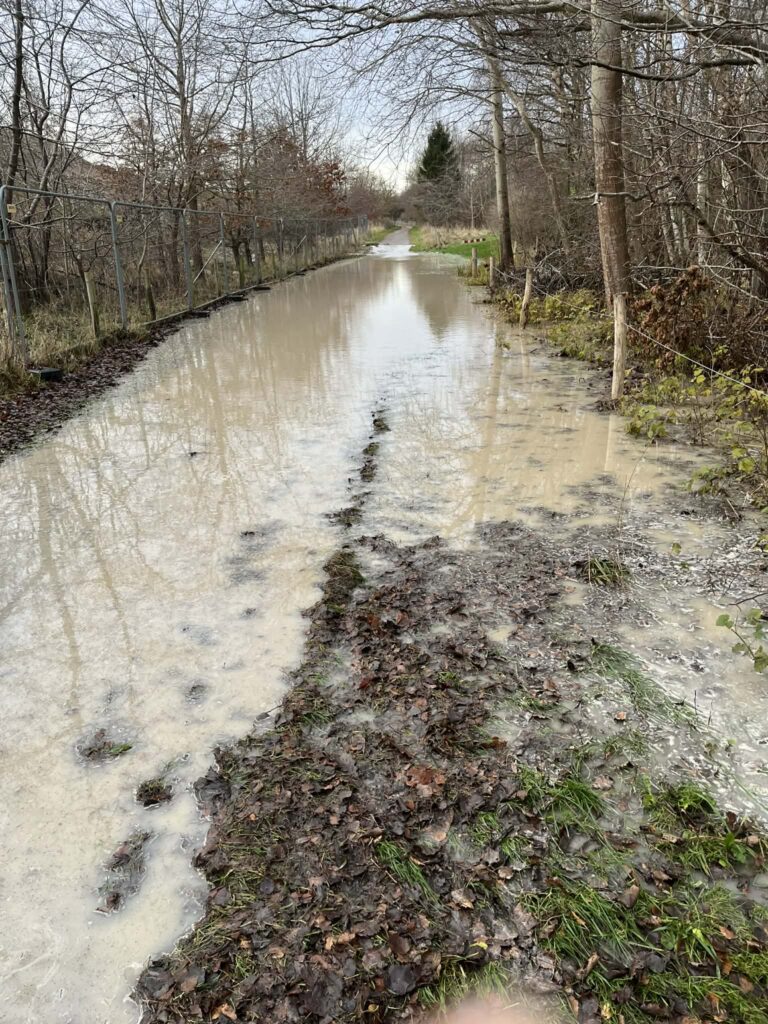 Søstien ved Søndersø blev i den grad oversvømmet, da der tirsdag morgen gik hul på en vandledning ved Værket ved Søndersø. Der var tale om en ledning, som fører vandet fra de omkringliggende kildepladser ind til blødgøringsanlægget Værket ved Søndersø.