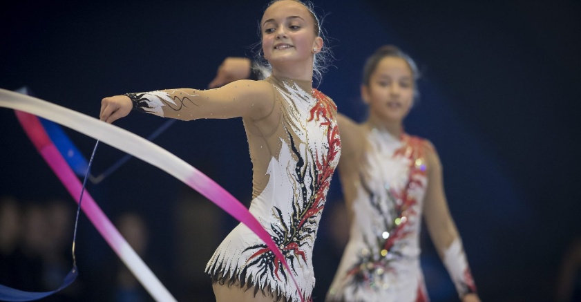 Tøndebånd, vimpler og bolde indgår i øvelserne i den æstetisk smukke olympiske sportsgren rytmisk sportsgymnastik.