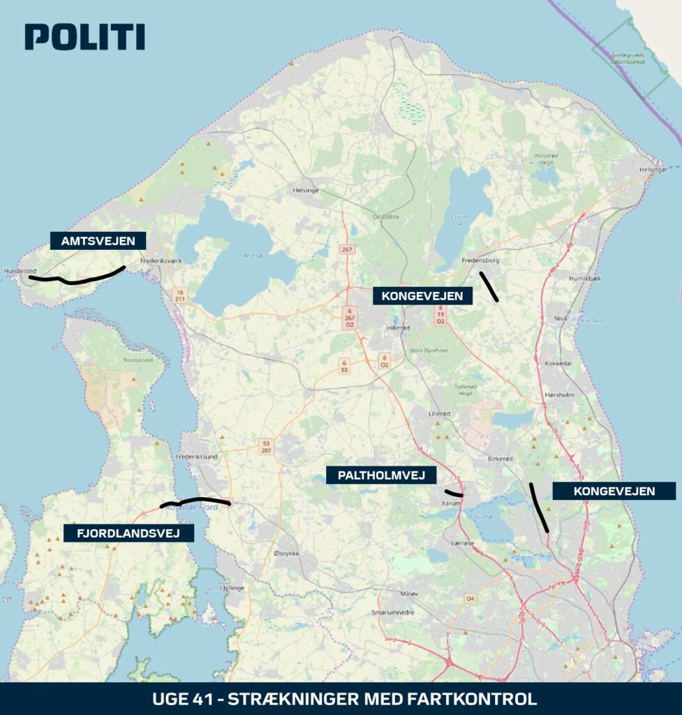 Nordsjællands Politi vil også være til stede på Kongevejen i Virum, Amtsvejen i Halsnæs, Kongevejen i Fredensborg og Fjordlandsvej i Frederikssund.