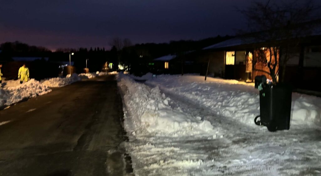 Snart opstår det næste problem. Et fortov er ikke ryddet. Det er spejlglat. Beholderen er sat ud til skelgrænsen, men Mikkel skal forcere det glatte stykke med en tung beholder. Det gør han ikke.