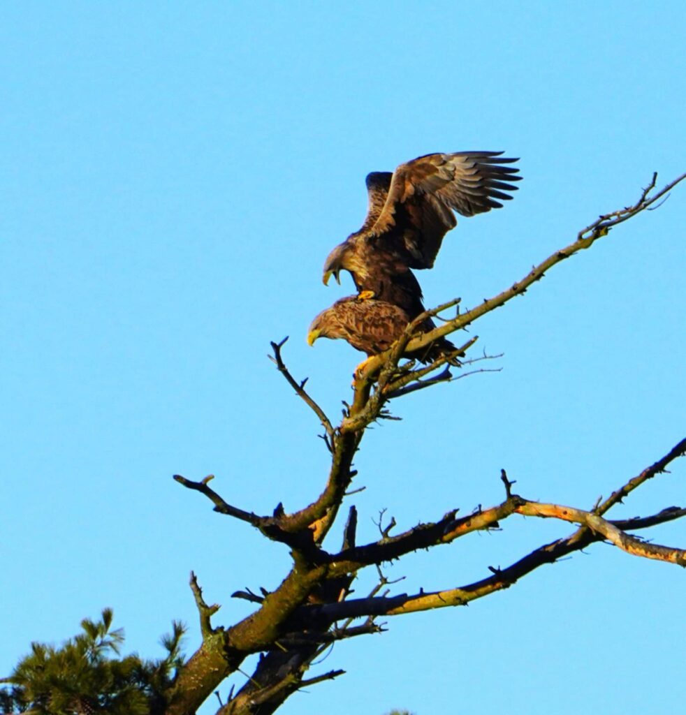 Tålmodigheden er en dyd. Ikke mindst for naturfotografer. Den lokale fotograf Brian Klarskov Jensen fik endelig et billede af de lokale havørne i gang med parringsakten.