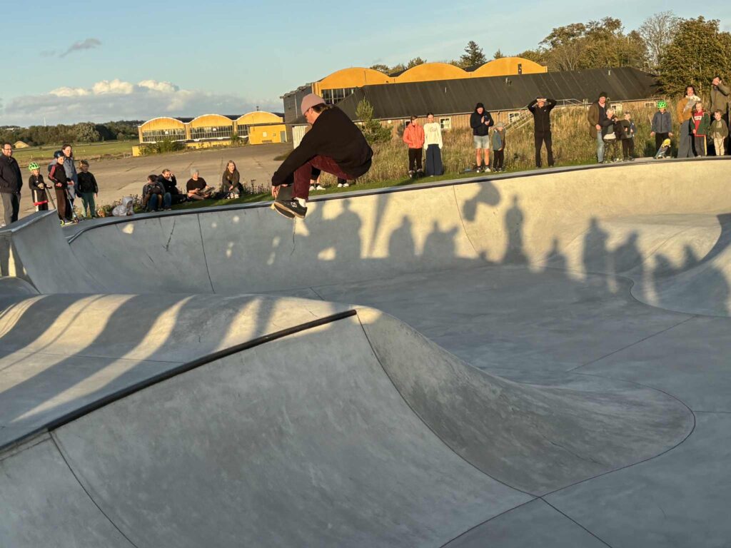 Omgivelserne er idylliske med en strålende solnedgang ude for enden af landingsbanen, men også blæsende. Kulden blev dog glemt, når skaterne lavede de vildeste tricks og spring.