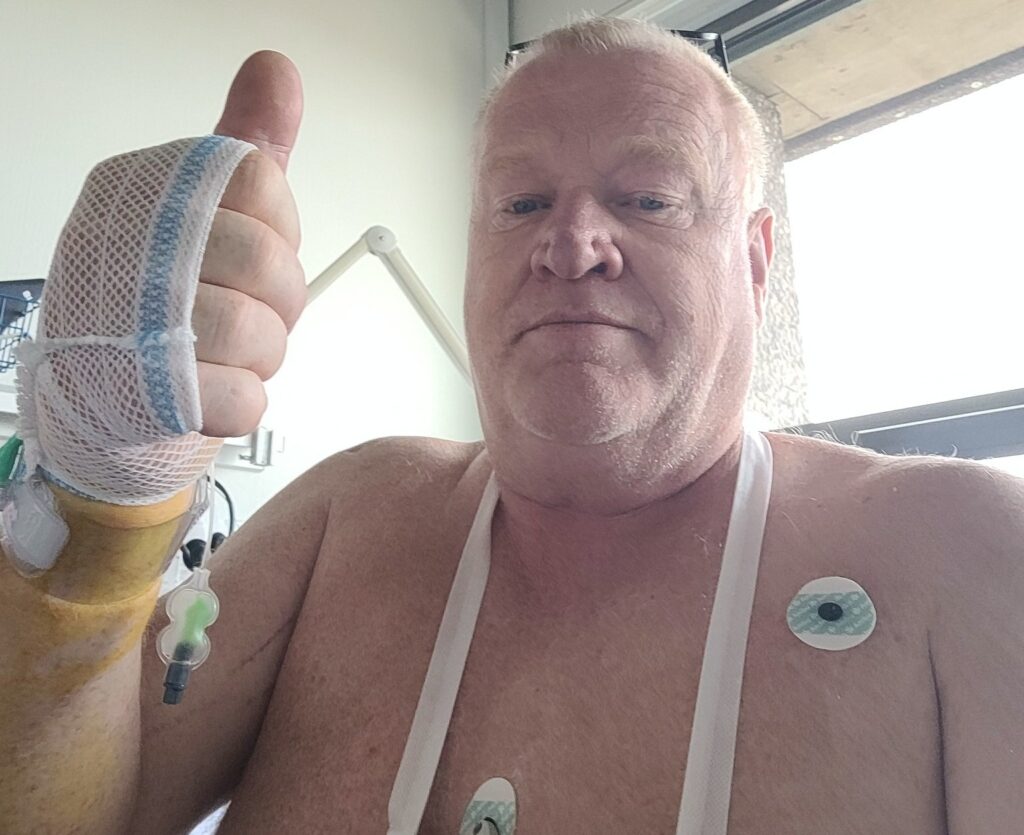 – Jeg var i lange perioder bevidstløs og kan kun huske få ting fra den tur. Jeg kom direkte på operationsstuen og blev opereret under lokalbedøvelse. Kirurgerne lavede en ballonudvidelse og fik fjernet blodproppen fra rygerblodkarrene, som de kaldte det. Det er der, hvor man får en blodprop, når man har røget som en skorsten og er gammel, forklarer Carsten Svensson, som dog kun er 59 år.